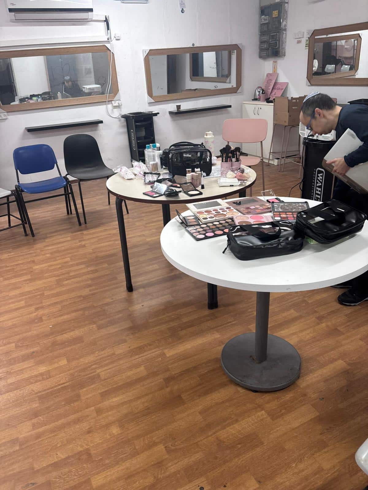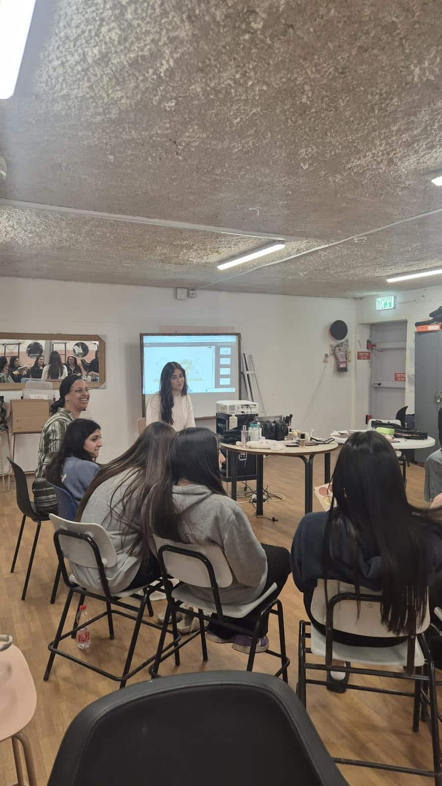 חדר עם מקרן, חשמל, שולחנות וכסאות. מקום עם מראות- יתרון(לא חובה)