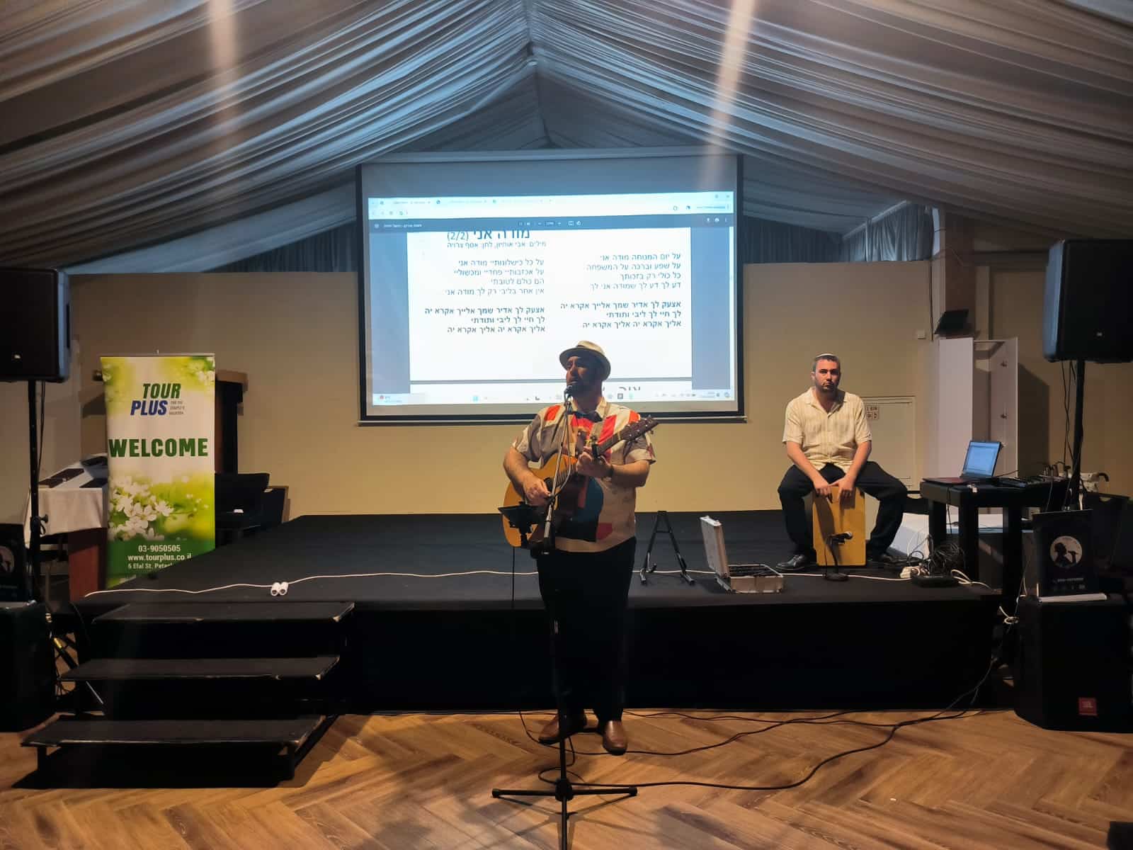בקצרה על החוויה: חווית שירה בציבור איתי, דניאל יהודה בליווי הגיטרה שלי שזכתה לנגן בכל העולם. מצגת שירים עדכנית ובה שירים מהתקופה לצד נכסי צאן ברזל, מסך ומקרן, מיקרופונים אלחוטיים לחלוקה לקהל, כלי הקשה, מתנות והרבה ציונות וכיף!:)